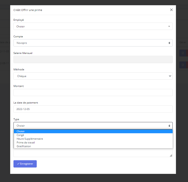 - Step 4: Apres avoir renseigner toutes les information ci-dessus selectionner le type de prime accordé avant d'enregistrer.