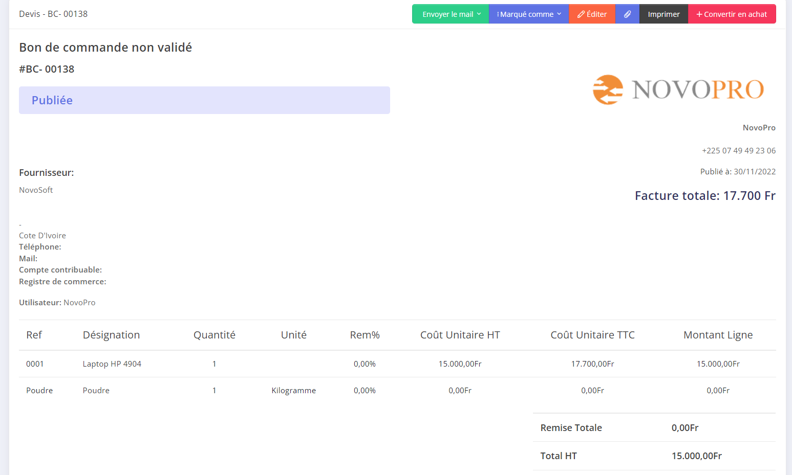 Un devis également appelé Proforma est un document qu'un vendeur (votre entreprise) fournit à un acheteur (votre client) pour offrir des biens ou des services à un prix indiqué, dans des conditions spécifiées, le cas échéant. Il permettra à votre client de savoir combien coûteront ses biens ou services avant de s'engager dans l'achat. Pour créer un devis dans Novopro, accédez à devis → Commande client