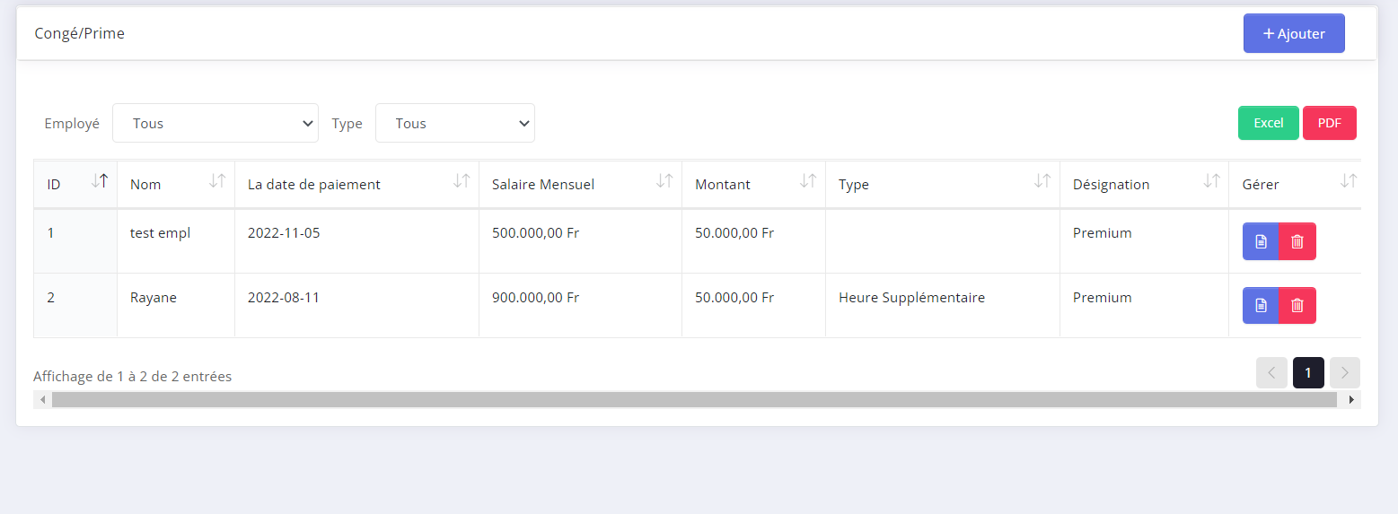 - Tous les congés, primes de travail ,heure supplémentaires et gratification accordé seront affichés dans Ressource humaine → Congé/prime.