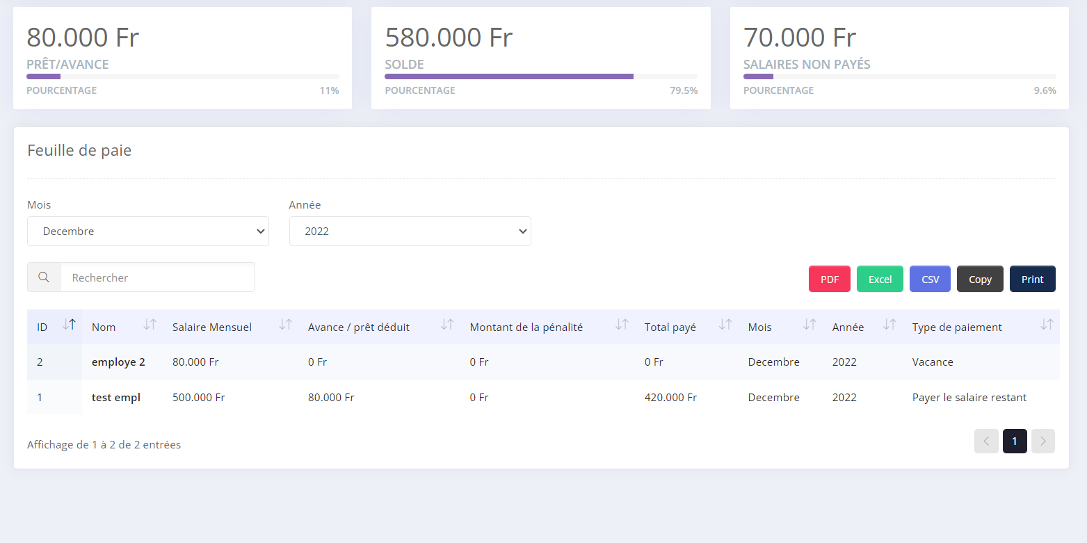 - Step 2: Ici vous verrez donc le salaire mensuel les avances/pret deduit les montants de penalités le total payé et le type de paiement de chacun de vos employés .
