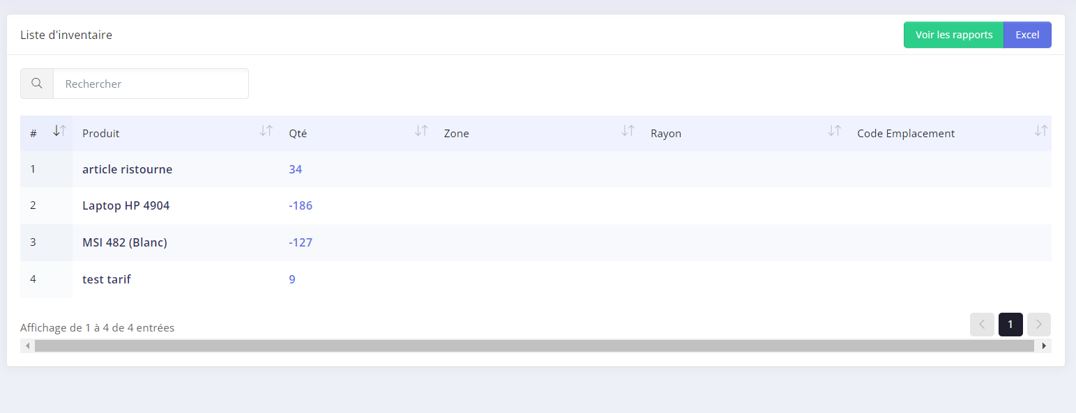 - Tous les articles et leurs stock seront affichés dans Produits et services → Inventaire.