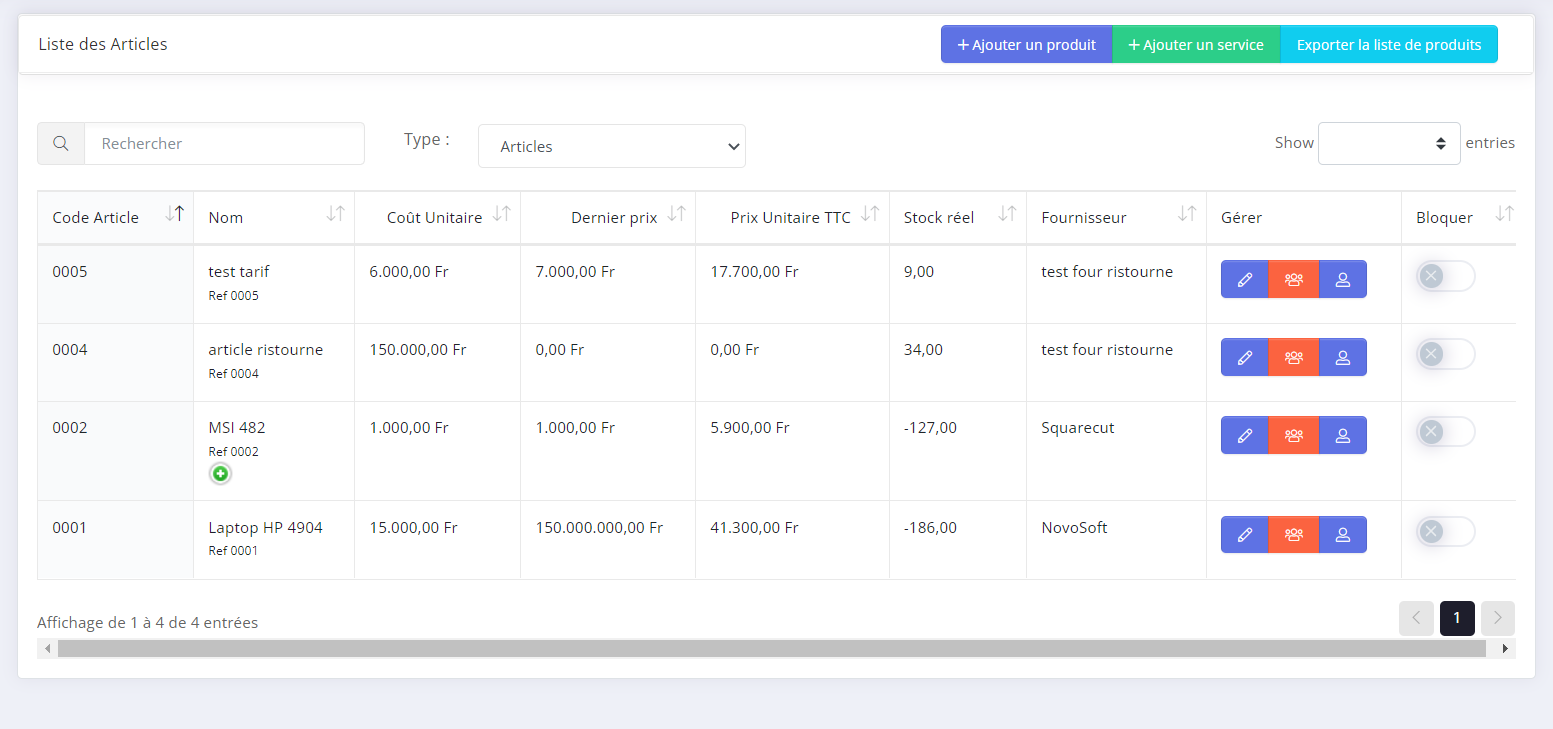 - La liste des articles contient tous les articles et/ou services que vous vendez,affichés dans Liste des articles → Produits et services.