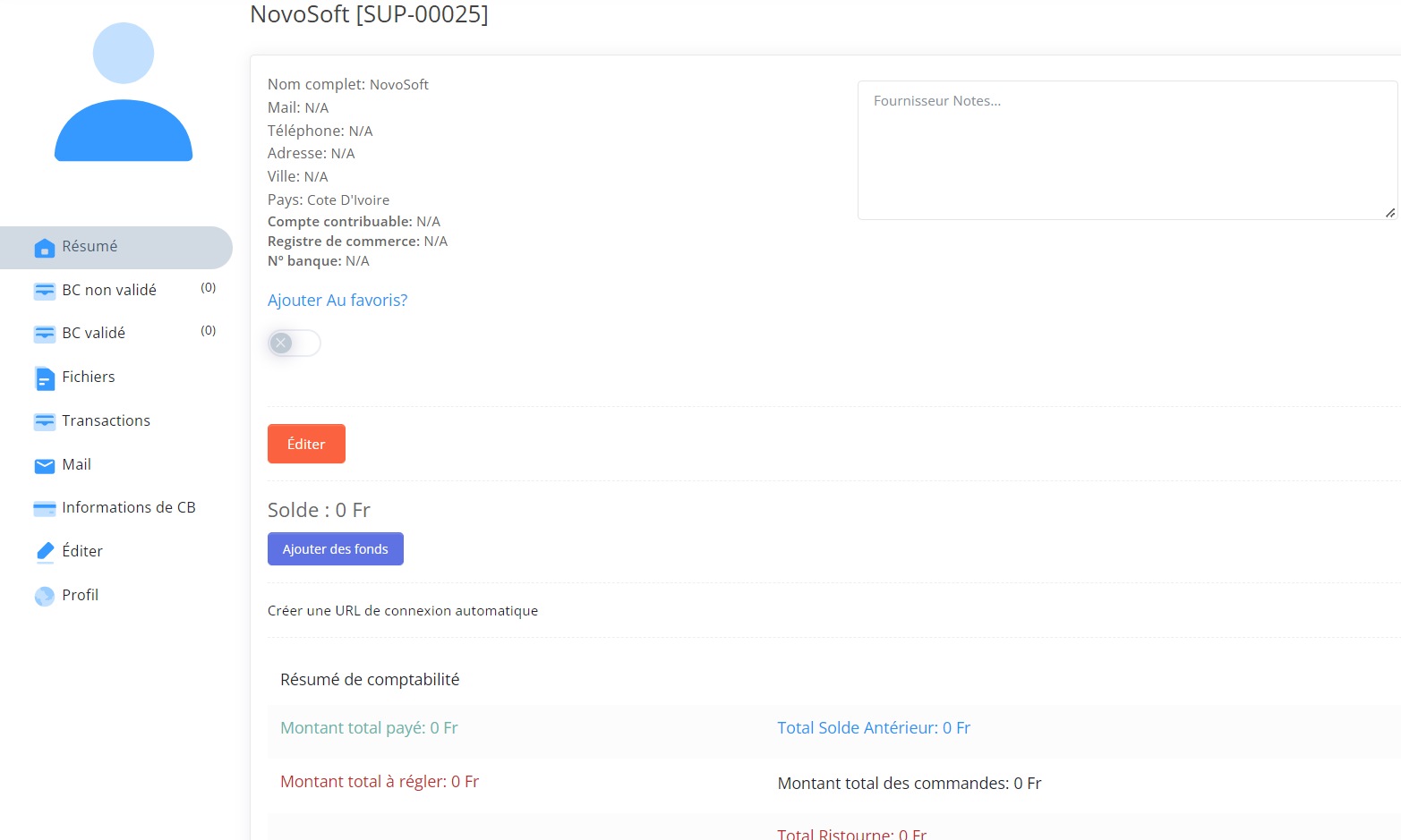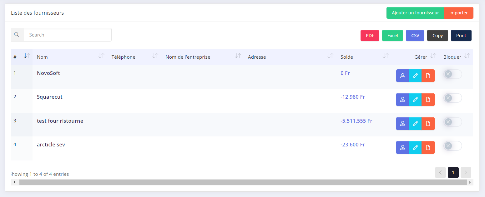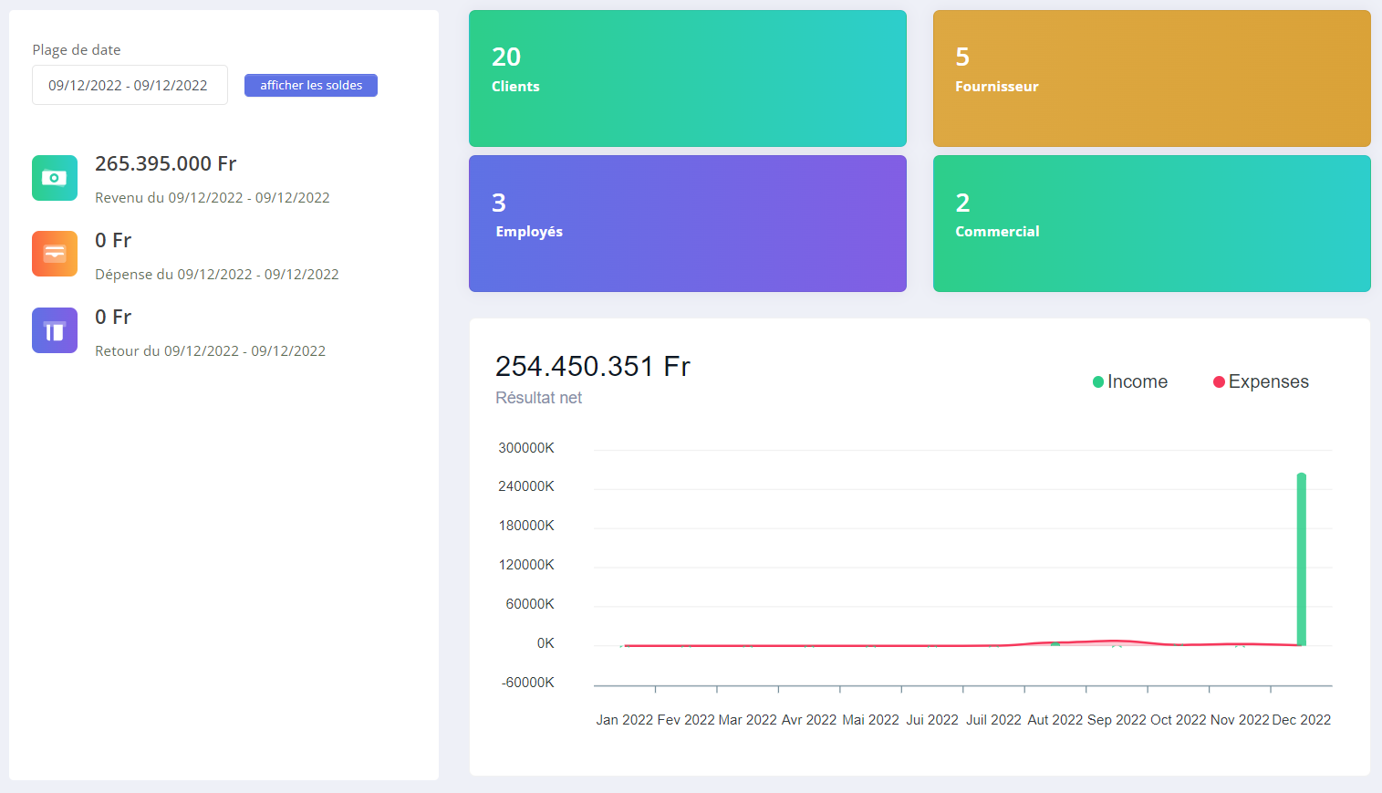 - Ici vous verrez le nombre de clients, fournisseurs,employés et commerciaux. Tous des boutons vous lient a la liste de ceux-ci.