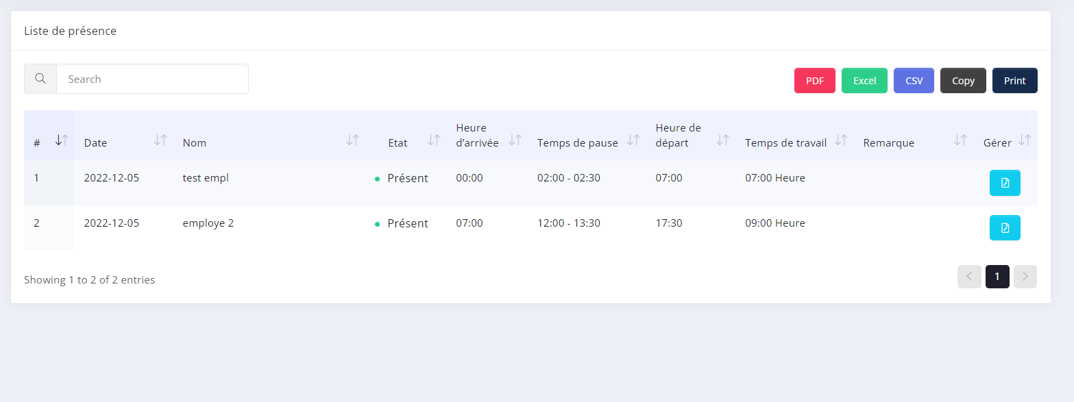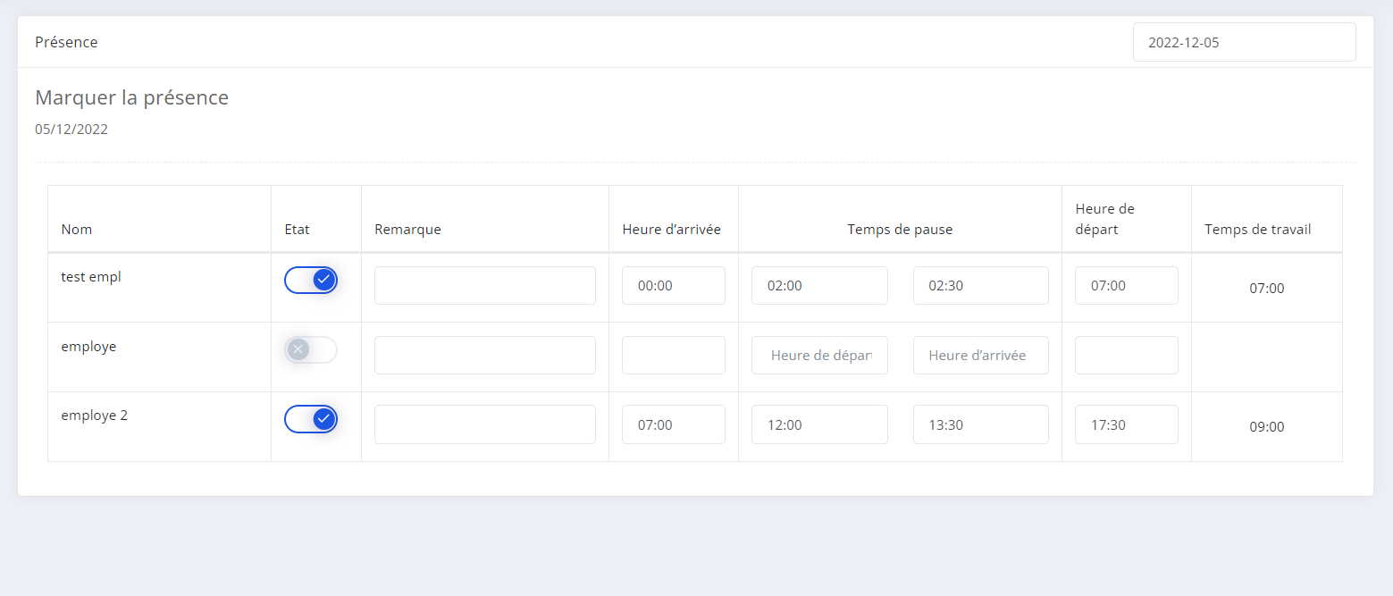 - Chaque jour vous aurez a noter l'heure d'arrivé de pause et de depart de vos employé