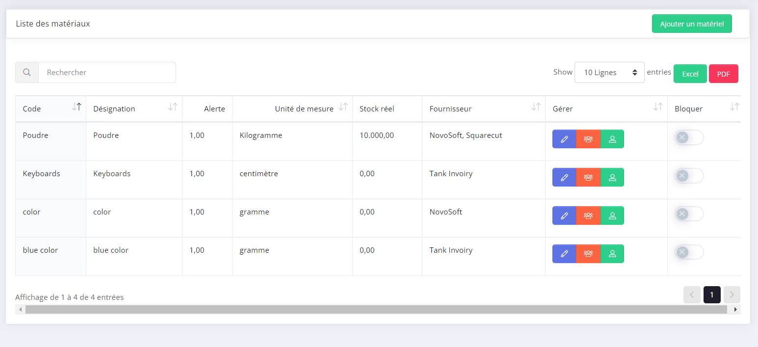 - La liste des Matieres premieres contient toutes les Matieres premieres que vous utilisez et/ou vendez,affichés dans Produits et services → Matiere premiere.