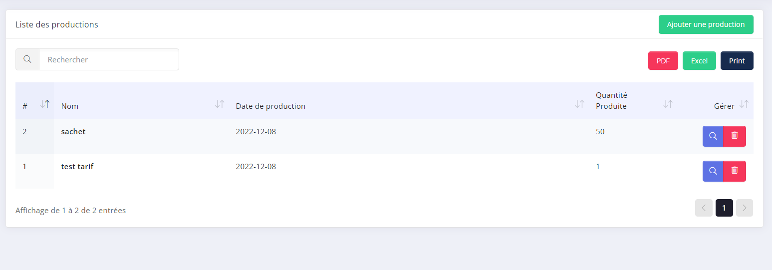 - Toutes les productions seront affichés dans Produits et services → Production.