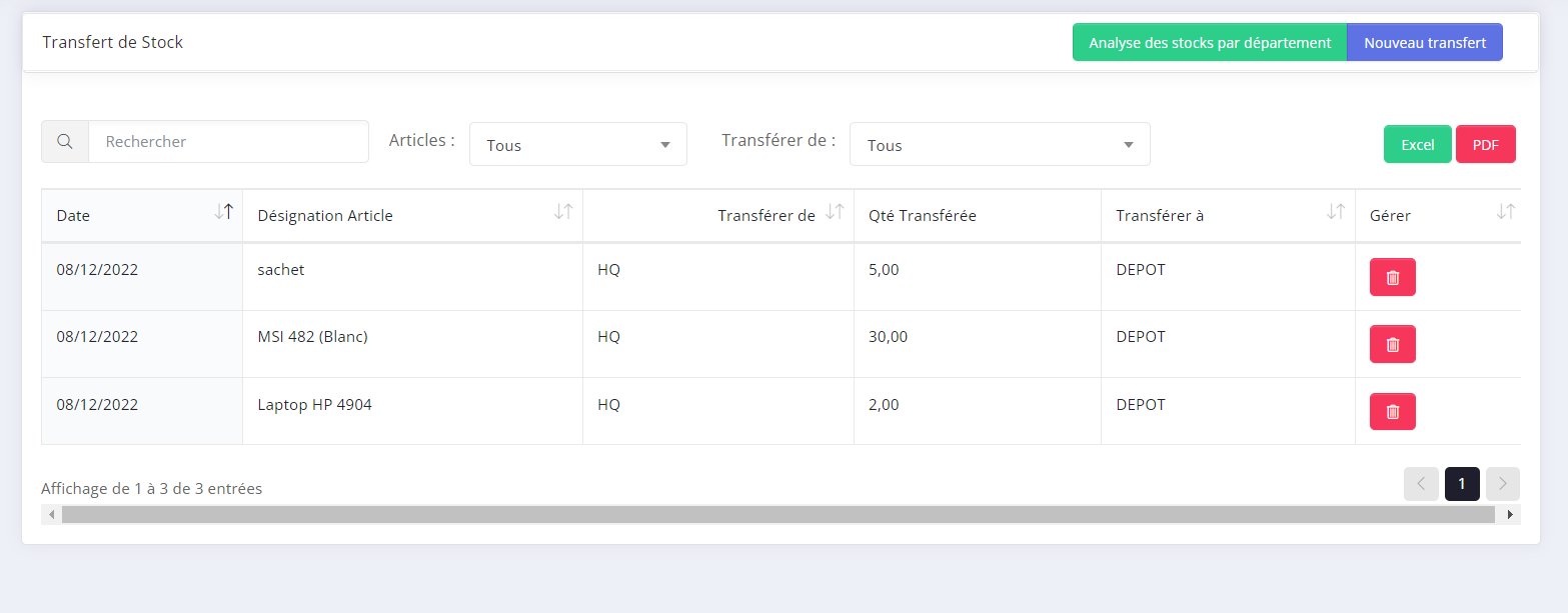 - Step 3: Vous pouvez filtrez sur un département pour voir tout les transfert effectuez par ce departement.